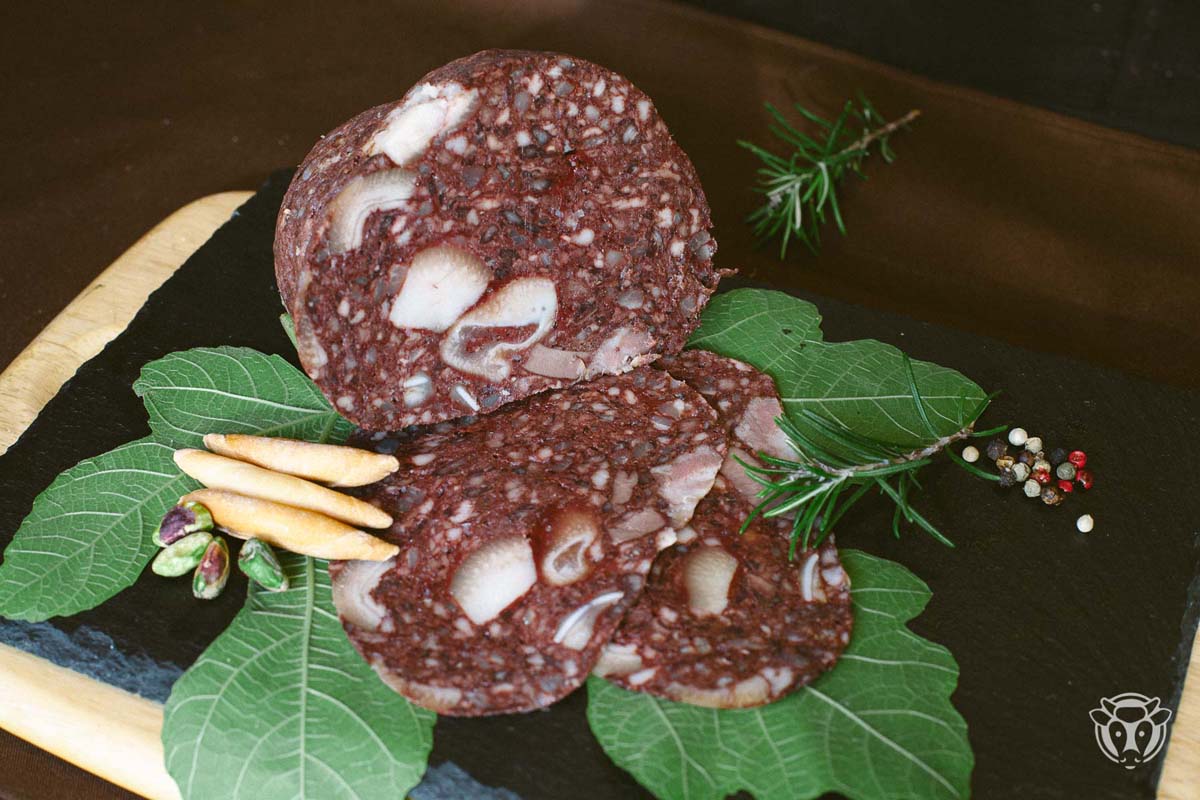 - Ingredients: Carn de porc, espècies i sang amb tripa natural.